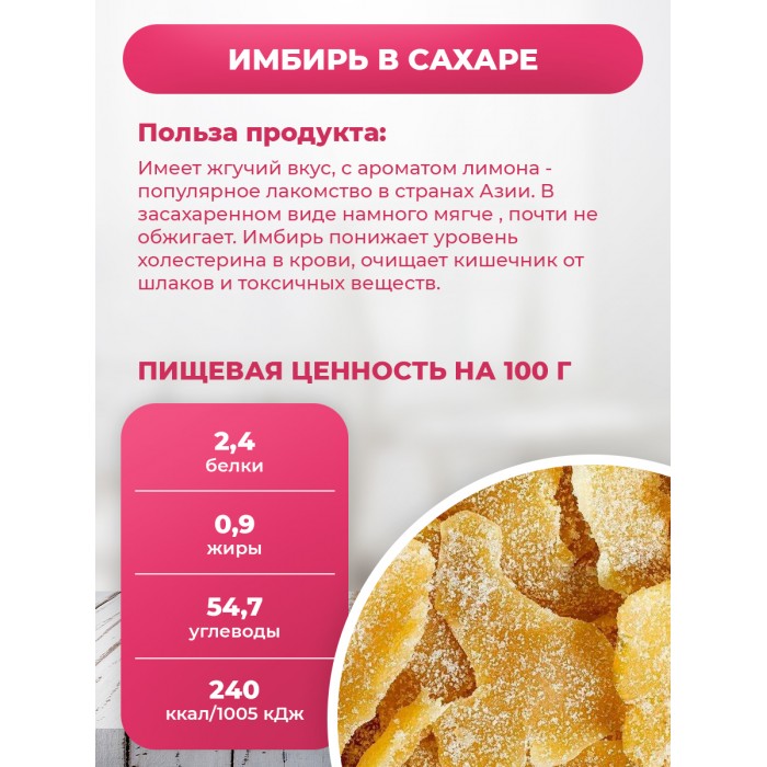 Имбирь в сахаре – пикантная закуска. Размягченные корни растения Zingiber пропитаны сахаром. У деликатеса терпкий сладкий вкус с пряным оттенком. Имбирь богат крахмалами, липидами, минералами, витаминами. Средство помога... Читать далее...