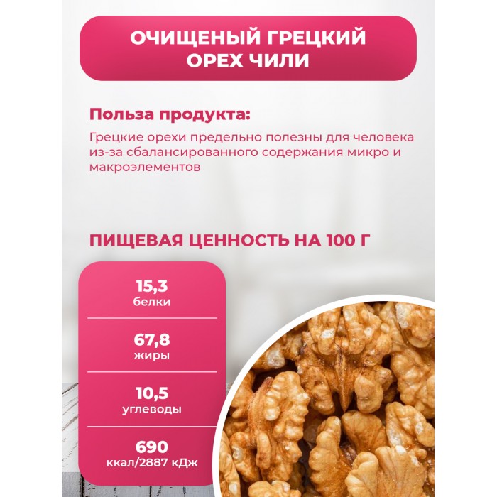 Грецкий орех ПРЕМИУМ очищенный Чилийский в банке самый распространенный в России. Он обладает приятным вкусом и полезен для организма человека. С ним готовят десерты, добавляют в основные блюда или едят в чистом виде.