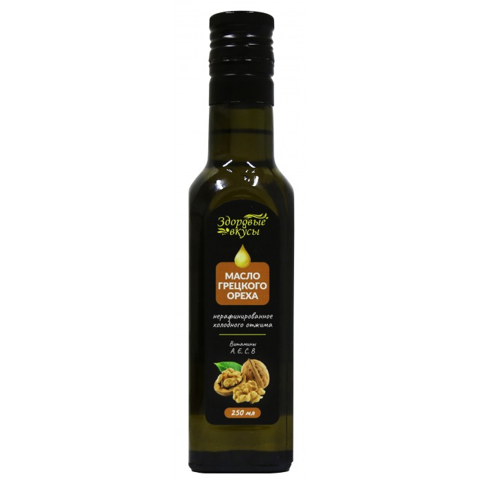 Масло грецкого ореха Здоровые Вкусы нерафинированное, прозрачное, светлое, вкус тонкий, выраженный (грецкий орех), характерный. Идеален для салатов, каш, маринадов, добавляется в тесто.