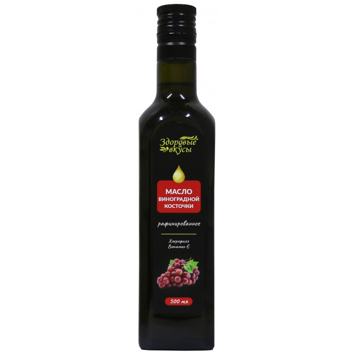 Масло виноградной косточки Здоровые вкусы рафинированное, прозрачное, с лёгким зеленоватым оттенком (из-за содержания хлорофилла), вкус тонкий, приятный, лёгкий. Подходит для жарки, используется для салатов, маринадов, выпечки.